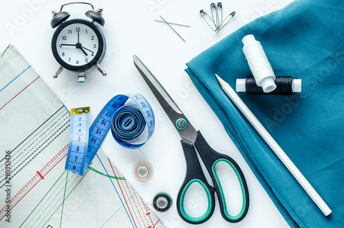 Sewing Order On Time Flat Lay Top View Copy Space Blue Fabric Watch Sewing Tools Needlework Accessories Pattern Threads Pins Bobbins Buttons Needles Measuring Tape On White Background Accessory Poster Accesso Elena